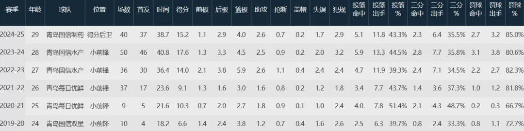 王睿泽,出生于1995年6月27日,刚过完自己的30岁生日不久,19届次轮5号秀,青岛队多年的核心前锋,上赛季常规赛场均15.2分4板2.6助,场均以35.5%命中率扔进2.3记三分球;季后赛则是场均15.5分4.3板1.4助,场均以38%命中率扔进2.4记三分球。